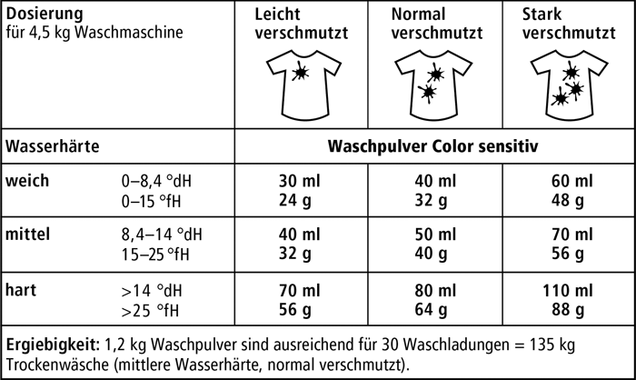 Wäscht äußerst effektiv und farbschonend, bereits ab 20 °C, Buntes und Feines aus Baumwolle, Leinen, Kunstfasern und Mischgewebe.