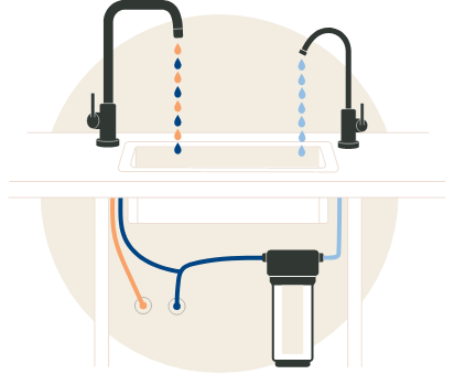mit zusätzlichem Wasserhahn. Bei der Variante A wird für das gefilterte Wasser ein separater Wasserhahn installiert. Damit ist die Trennung zwischen Nutzwasser und Trinkwasser eindeutig. Für den separaten Wasserhahn ist eine zusätzliche Bohrung an der Spüle oder in der Arbeitsplatte notwendig.